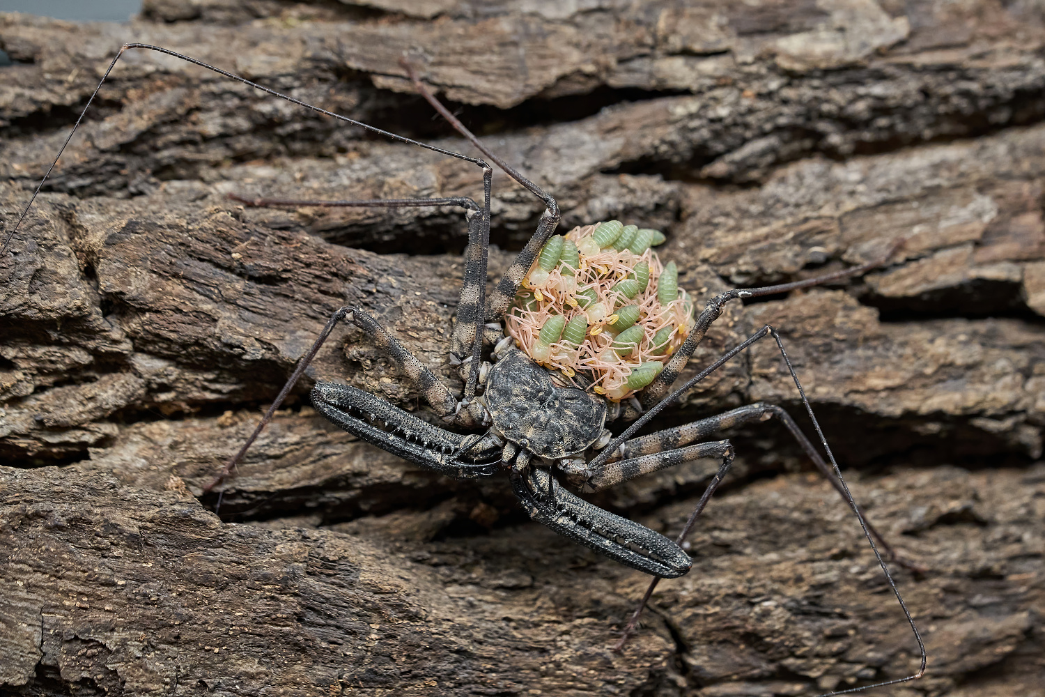 Nejvíce mláďat bylo u bičovců pestrých (Damon variegatus), celkem 25 (jak symbolické pro nový rok). Tito afričtí pavoukovci, kteří jsou známí především fanouškům Harryho Pottera, se v zoo množí pravidelně. Dorůstají velikosti 3–5 cm a mají široké ploché tělo. První pár kráčivých nohou je přeměněn v tenké hmatové orgány nesloužící k chůzi. Mohou připomínat bič, odtud český název. Druhý pár končetin je přeměněn na velké pedipalpy neboli makadla, které využívá k lovu kořisti (hmyzu). Samec při namlouvání pouští na podklad spermatofor, který samice vstřebá do svého pohlavního orgánu. Po dvou týdnech naklade vajíčka na spodní stranu svého zadečku. Tam zůstanou přilepená a krytá speciální látkou, která je chrání před poškozením. Po 100 až 120 dnech se z vajíček vylíhne 10 až 45 larev. Ty pak zůstávají na matčině zadečku (viz foto) a opouští jej po prvním svlékání. Mladí bičovci žijí ve společenstvích do doby tří až čtyř svleků. Pak si samci začnou vytvářet a bránit svá teritoria. Tento druh je v zoo chován v zázemí, návštěvníci však mohou v noční expozici pavilonu Tanganika pozorovat jiný druh – bičovce tyčkovitého (Euphrynichus bacillifer), který se také pravidelně rozmnožuje.