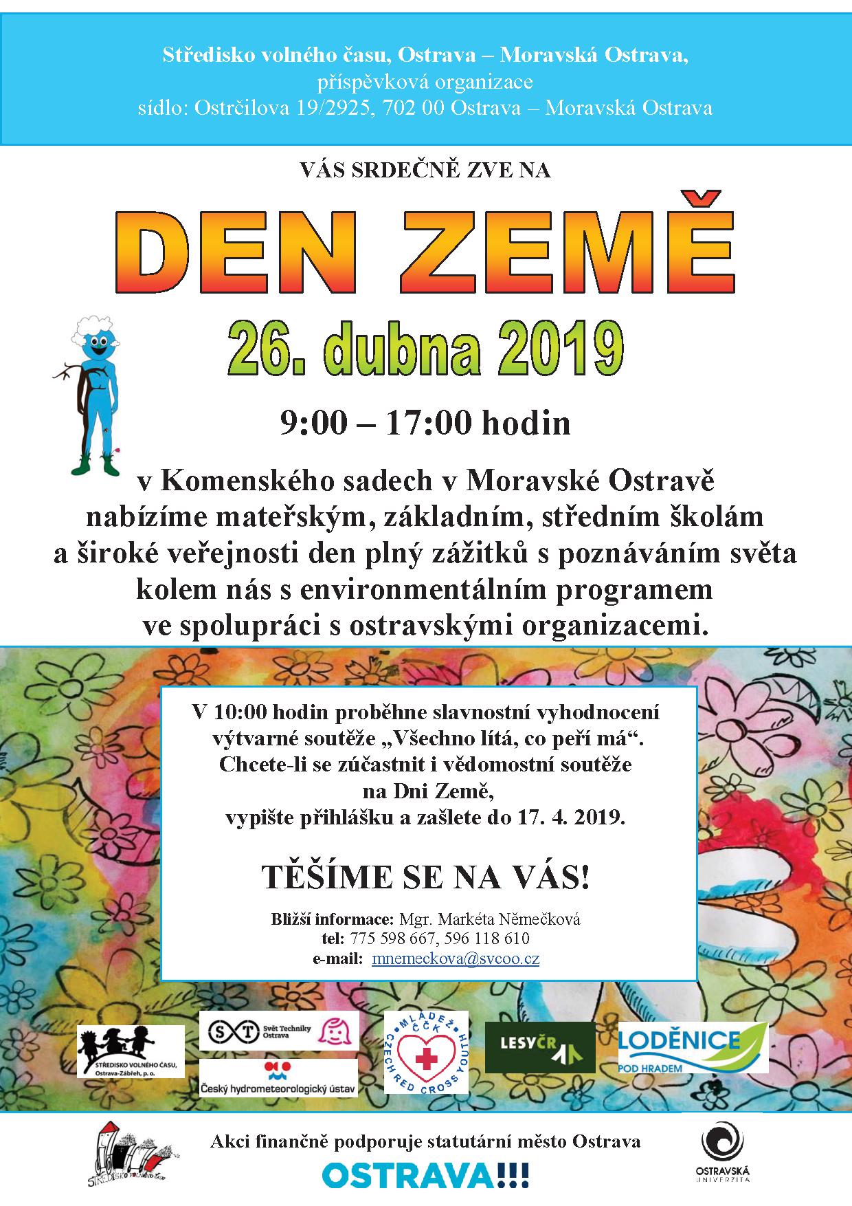 Konec pracovního týdne patří tradičně Dni Země v Komenského sadech. V pátek 26. dubna 2019 připravilo den plný zábavy a poučení Středisko volného času Ostrava, Moravská Ostrava ve spolupráci s Ostravskou univerzitou a dalšími organizacemi. Na akci budou také vyhlášeny výsledky výtvarné soutěže „Všechno lítá, co peří má“.