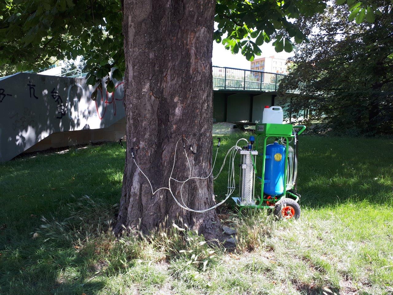Letošní ošetření jírovců spočívalo v provedení tzv. endoterapie (stromové mikro-injektáže), při které byl do kmenů stromů za pomocí speciálních tlakových zařízení aplikován koncentrát účinné látky insekticidu. Látka byla napouštěna pomocí jehel do předem připravených vývrtů tak, aby strom následně injektovanou látku rozvedl vodícími pletivy do všech jeho částí, tedy i do listů, které bývají požírány housenkami klíněnky jírovcové. Samotná přítomnost insekticidních látek v listoví pak způsobuje minimální životnost škodlivých housenek a snižování celkové populace klíněnky, což se naopak pozitivně projevuje na stavu takto ošetřených jírovců, které pak předčasně nehnědnou a neopadávají.