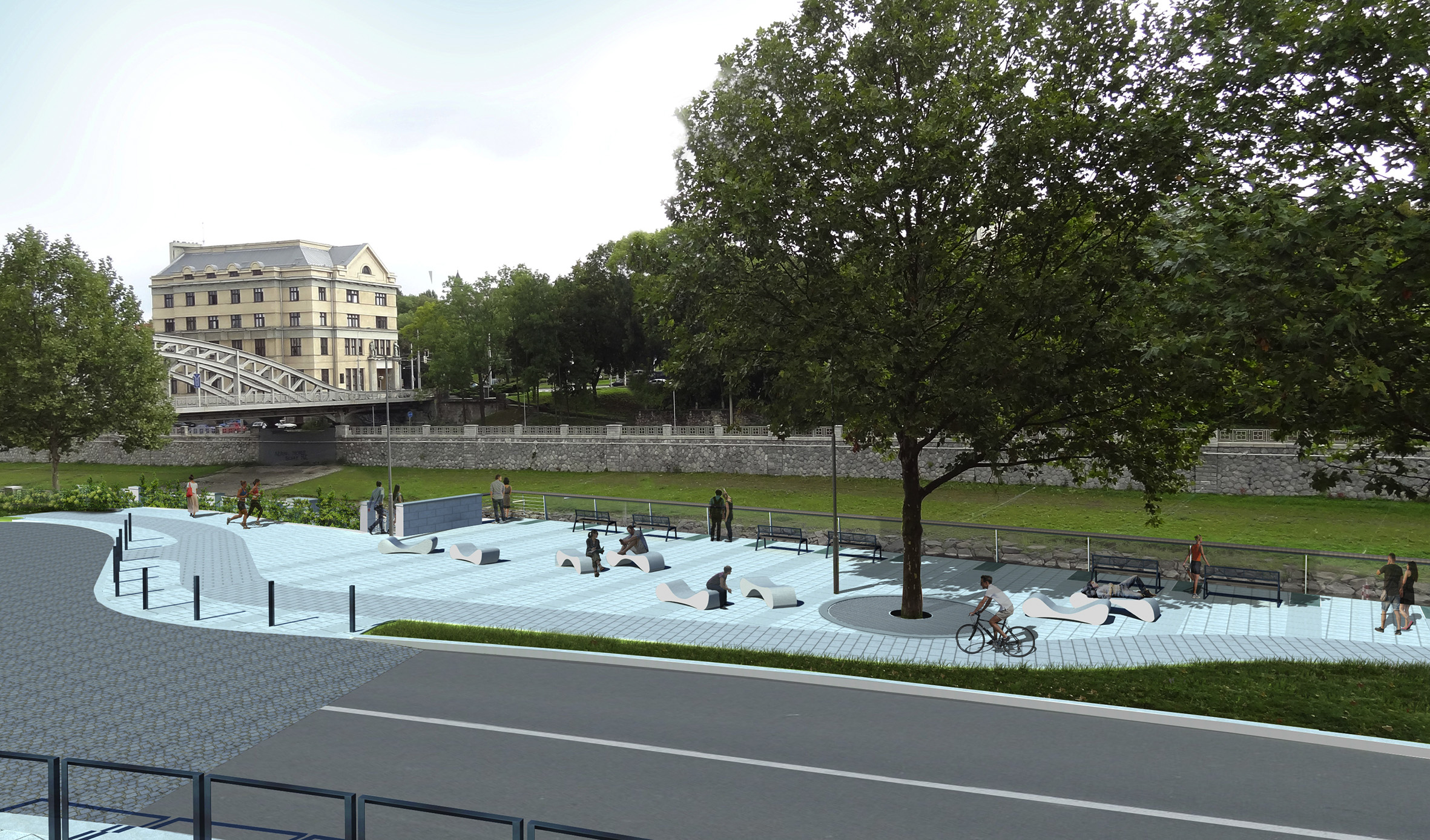 Místo bude doplněno o designový mobiliář, výsadbu stromů a květin. Práce začaly v těchto dnes přeložkou elektrického vedení, hotovy by měly být v září. Na tento úsek bude navazovat rekonstrukce sjezdu ze Sýkorova mostu na Havlíčkovo nábřeží po ulici Na Hradbách.