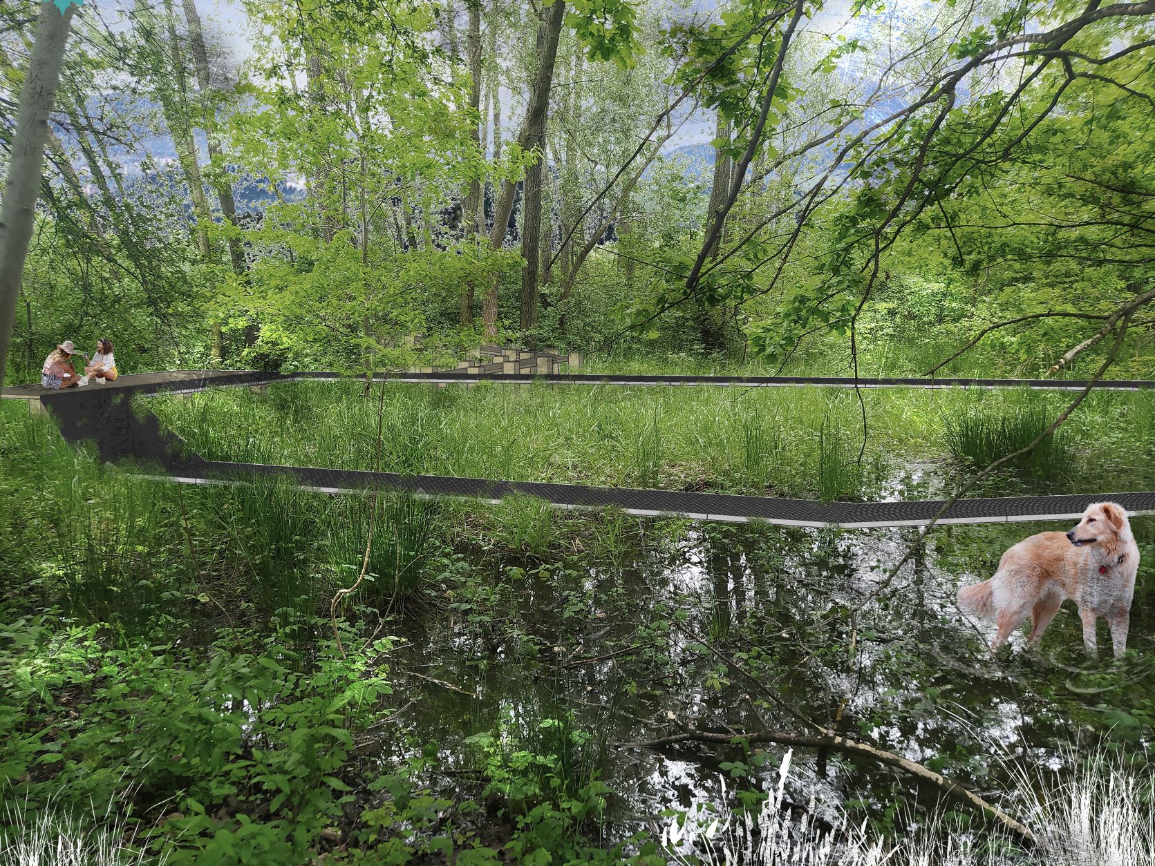 Budoucí podoba mokřadní plochy v Hrabové. Vizualizace: Ateliér ZAKA22, (Magda Cigánková Fialová, Petra Lindovská)