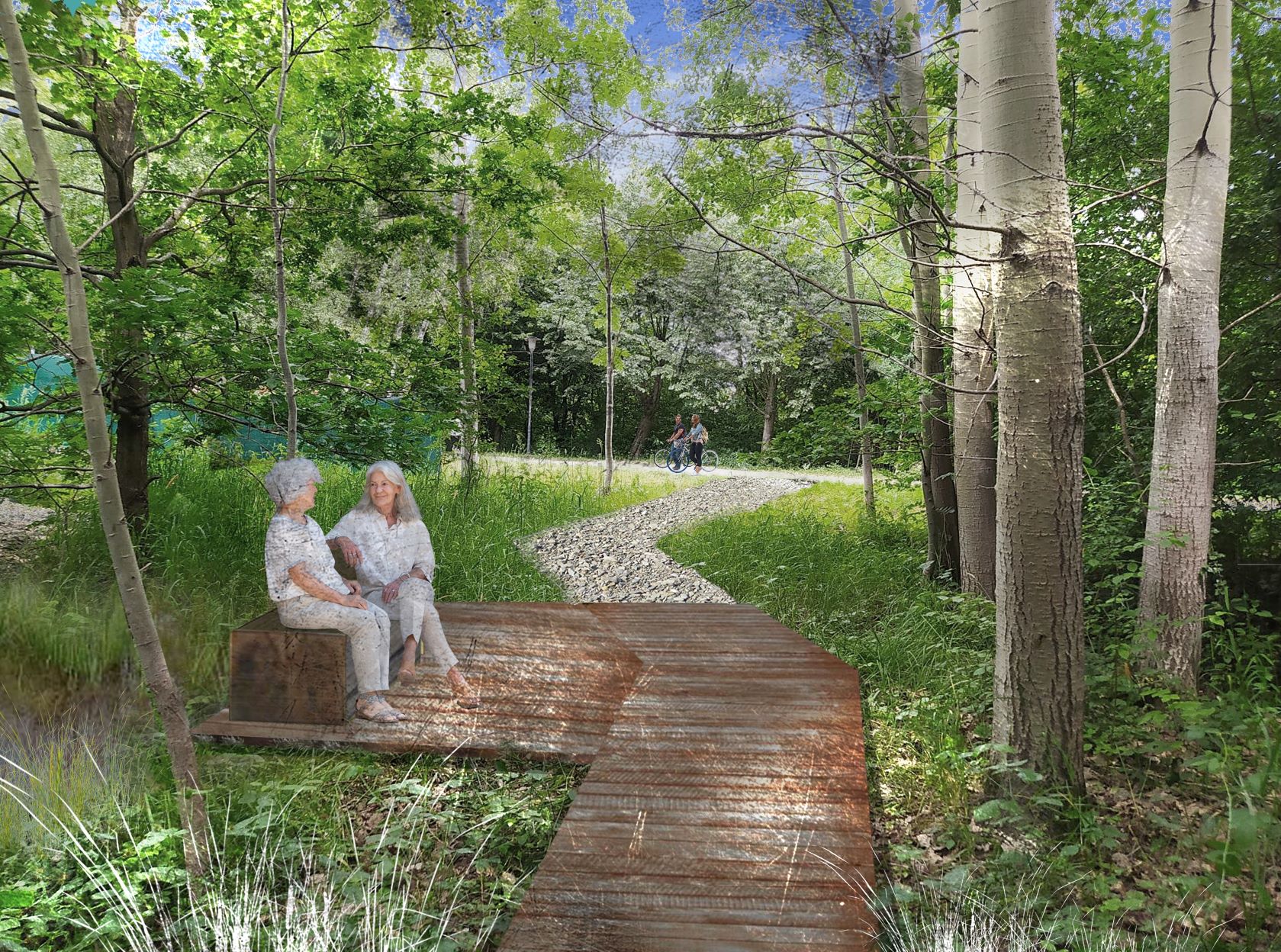 „Při oslovení obvodem jsme s kolegyní byly nadšené z lokality, která je výjimečná svou polohou. Je uvnitř obvodu, ale nenavazuje na zahuštěnou zástavbu. Územní plán sice připouští v okolí bytovou výstavbu, ale nyní se pouze severně nachází novostavba s byty pro seniory. Původní stav byl pro nás výzvou. Nepřehledný podmáčený a zcela nevyužívaný prostor. Po terénním průzkumu jsme zde začaly vidět unikátní možnost propojit podmáčenou lokalitu s volnočasovou funkcí. Navrhly jsme soustavu dřevěných povalových chodníků a odpočívadel s dvěma okruhy z pororoštů, které budou časem co nejméně opticky vyčnívat nad mokřad. Našim záměrem je podpořit to, co již v lokalitě samo bylo. Bude to i dobrý příklad hospodaření s vodou, který bude lidem dostupný a jasně srozumitelný. Na místě bylo příjemně i v letních termínech. Kromě klasické dendrologie jsme pracovaly i s informacemi z biologického a hydrogeologického průzkumu. V rámci realizace na vše dohlížíme a těšíme se na následný monitoring vývoje lokality,“ říká za ateliér ZAKA22 Magda Cigánková Fialová.
