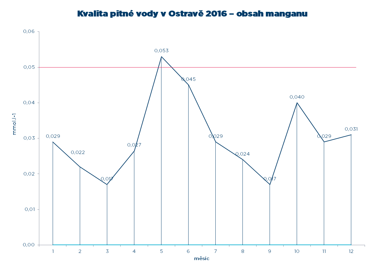 V případě obsahu manganu došlo v roce 2016 k jednomu překročení limitu 0,05 mg.l-3 stanoveného vyhláškou č. 252/2004 Sb., a to v měsíci květnu, odběrové místo Hrabová (0,053 mg.l-3).