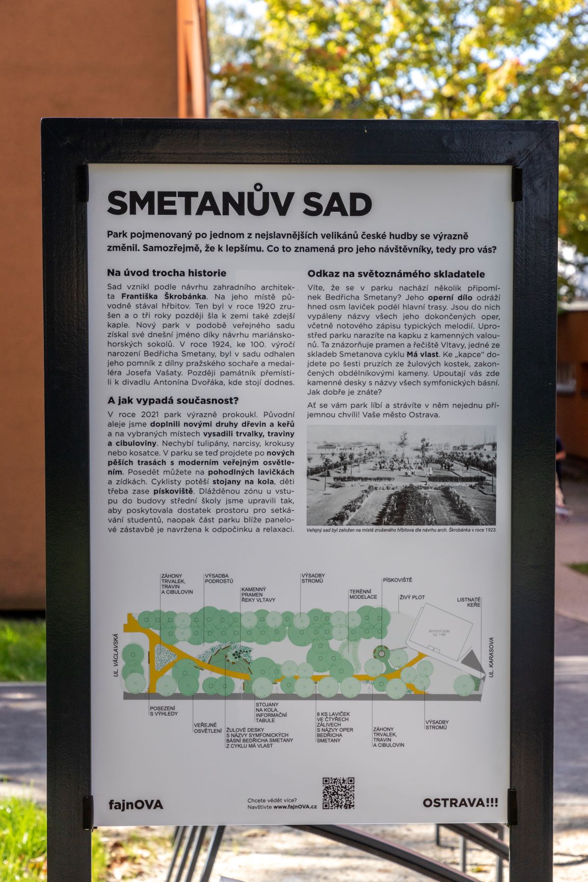 „Když se podíváme do historie, tak víme, že původně zde stával hřbitov. Ten byl v roce 1920 zrušen, zdemolována byla i zdejší kaple. Sad vznikl podle návrhu zahradního architekta Františka Škrobánka. Nový park v podobě veřejného sadu získal své dnešní jméno díky návrhu mariánskohorských sokolů. V roce 1924, ke 100. výročí narození Bedřicha Smetany, byl v sadu odhalen jeho pomník z dílny pražského sochaře a medailéra Josefa Vašaty. Později památník přemístili k divadlu Antonína Dvořáka, kde stojí dodnes. Smetanův sad poslední léta chátral, zeleň byla neudržovaná, chodníky popraskané. Proto jsme se rozhodli jej celý změnit. Nezapomněli jsme ani na odkaz skladatele Bedřicha Smetany,“ dodala náměstkyně primátora Kateřina Šebestová.