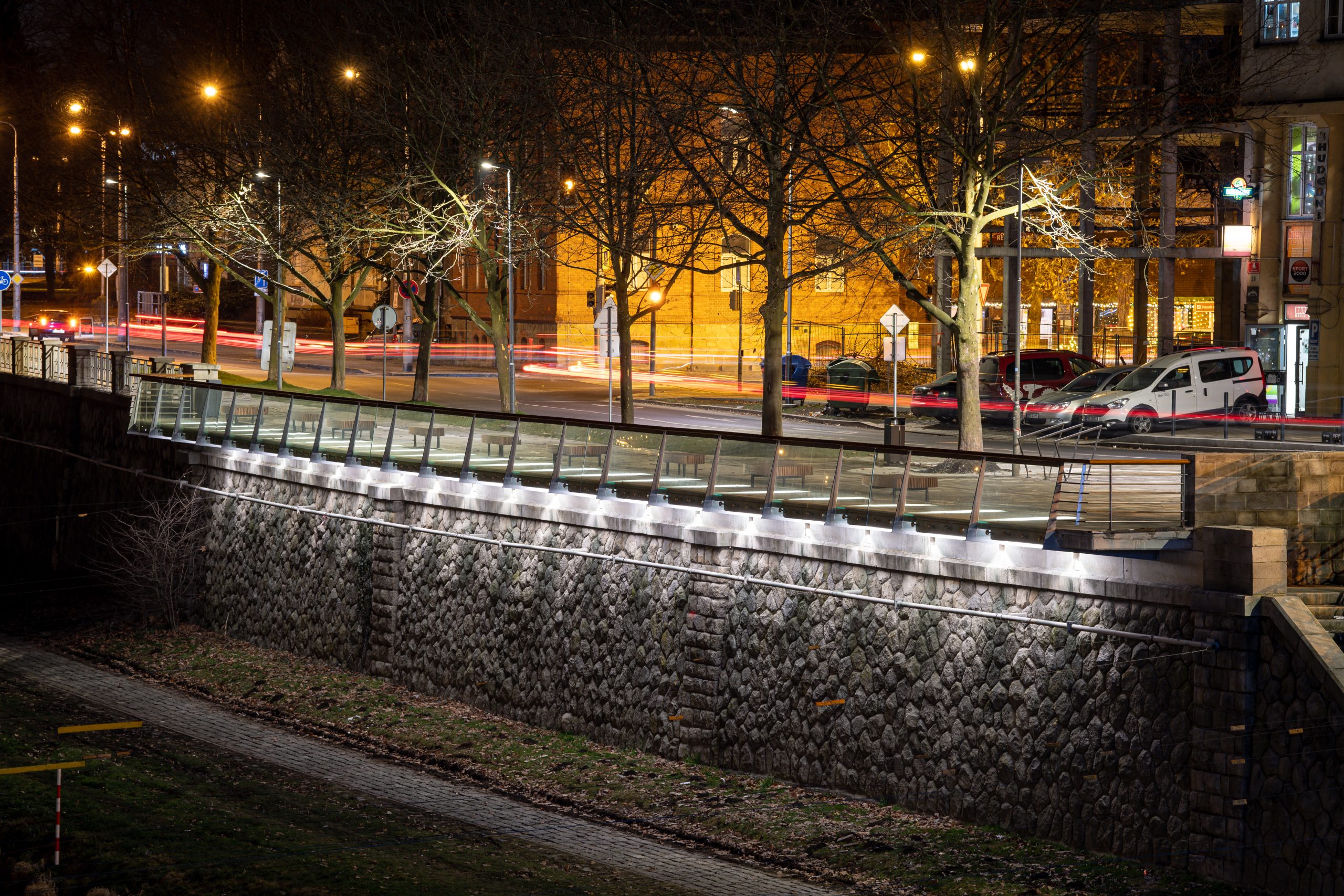 Úsek ohraničený ulicemi Na Hradbách a Kostelní doznal také změn. Přibylo v něm nově 210 délkových metrů cyklostezky a chodníku podél nábřežní zdi, chodník i komunikace mají nový povrch. Zaparkovat lze na 21 parkovacích místech. Rekonstrukcí prošlo rovněž veřejné osvětlení, kdy bylo provedeno nové kabelové vedení sítě, včetně stožárů a svítidel s LED technologií.