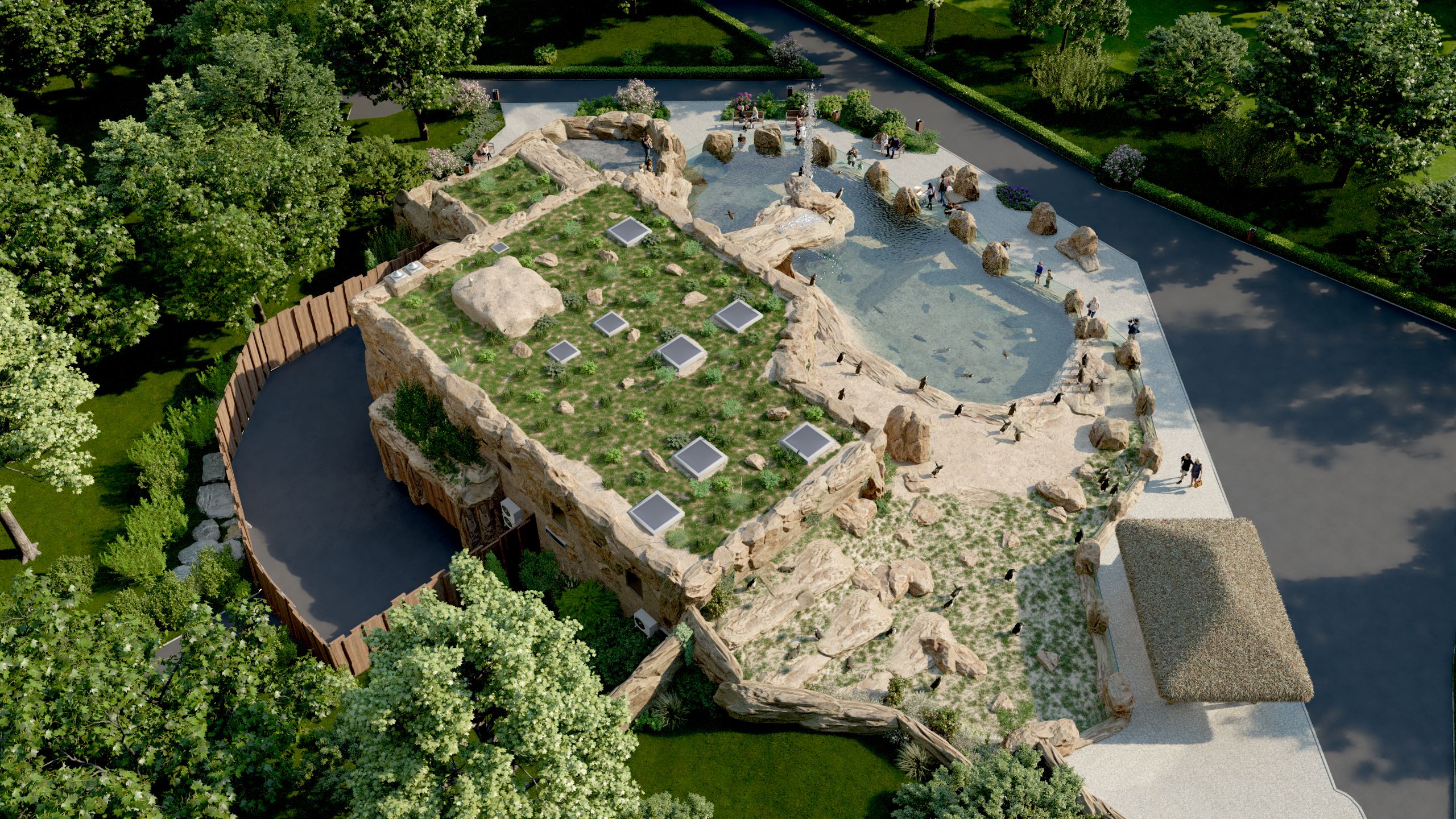 Z jeskyně bude možné vystoupit dvojramenným schodištěm na střechu zázemí tučňáků, která bude tvořit vyhlídku, z níž budou moci návštěvníci sledovat shora bazén i venkovní výběh tučňáků. V zázemí stavby budou místěny nezbytné technologie k úpravě vody bazénu, dále vnitřní ubikace a bazény tučňáků a prostory zoologického a technického vybavení.