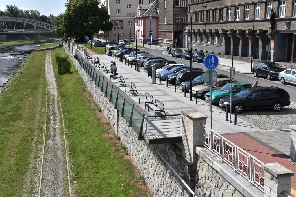 Havlíčkovo nábřeží v centru Ostravy ozvláštnily dvě visuté vyhlídkové galerie. První navazuje na nové parkoviště před budovou krajského soudu a druhá je v ose ulice Matiční.