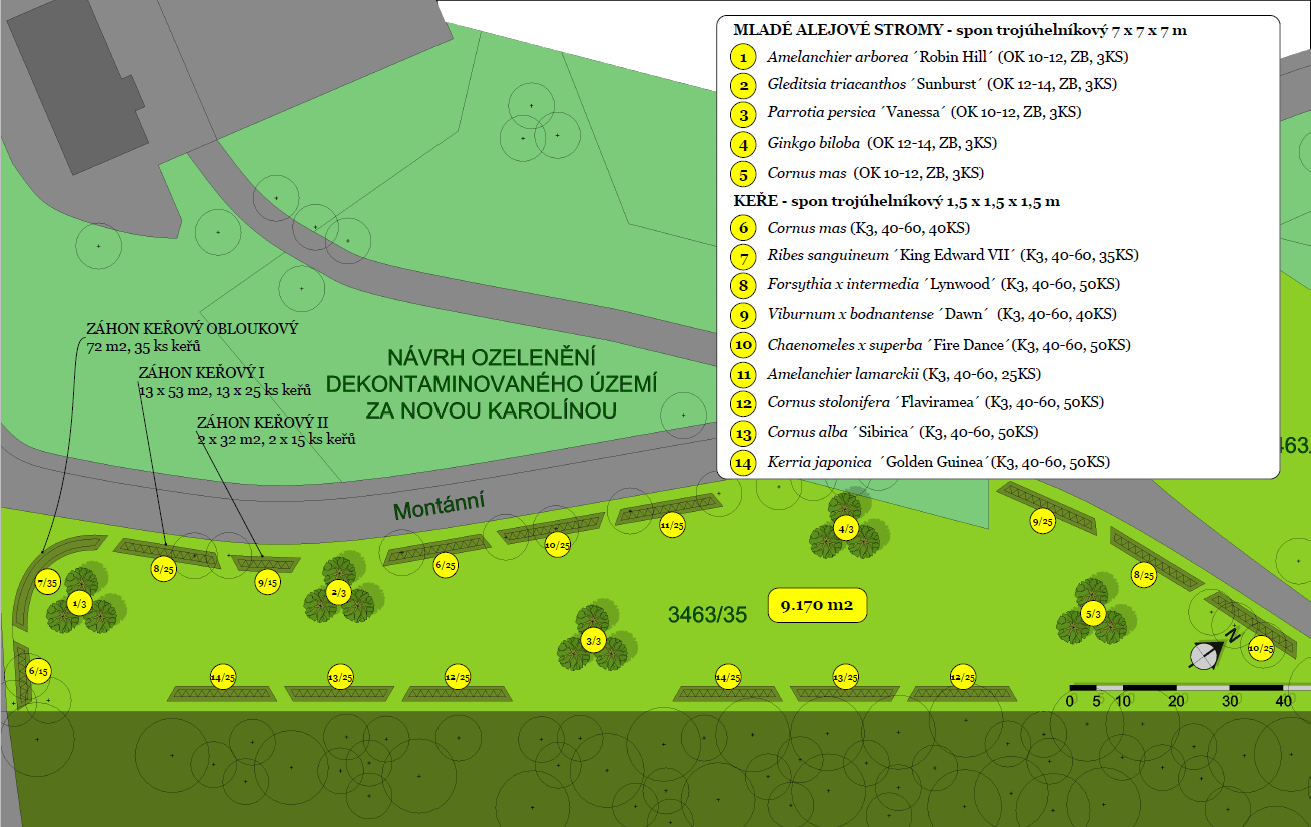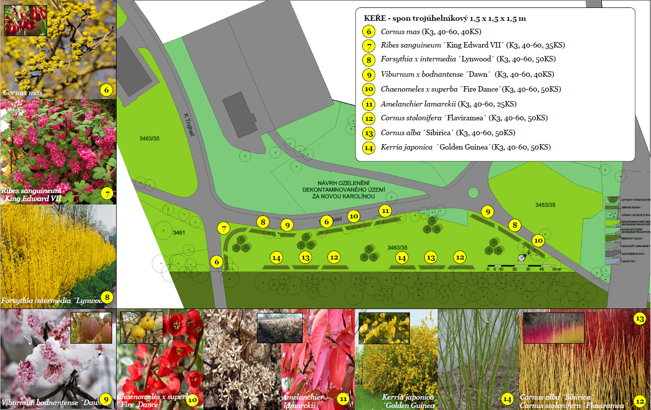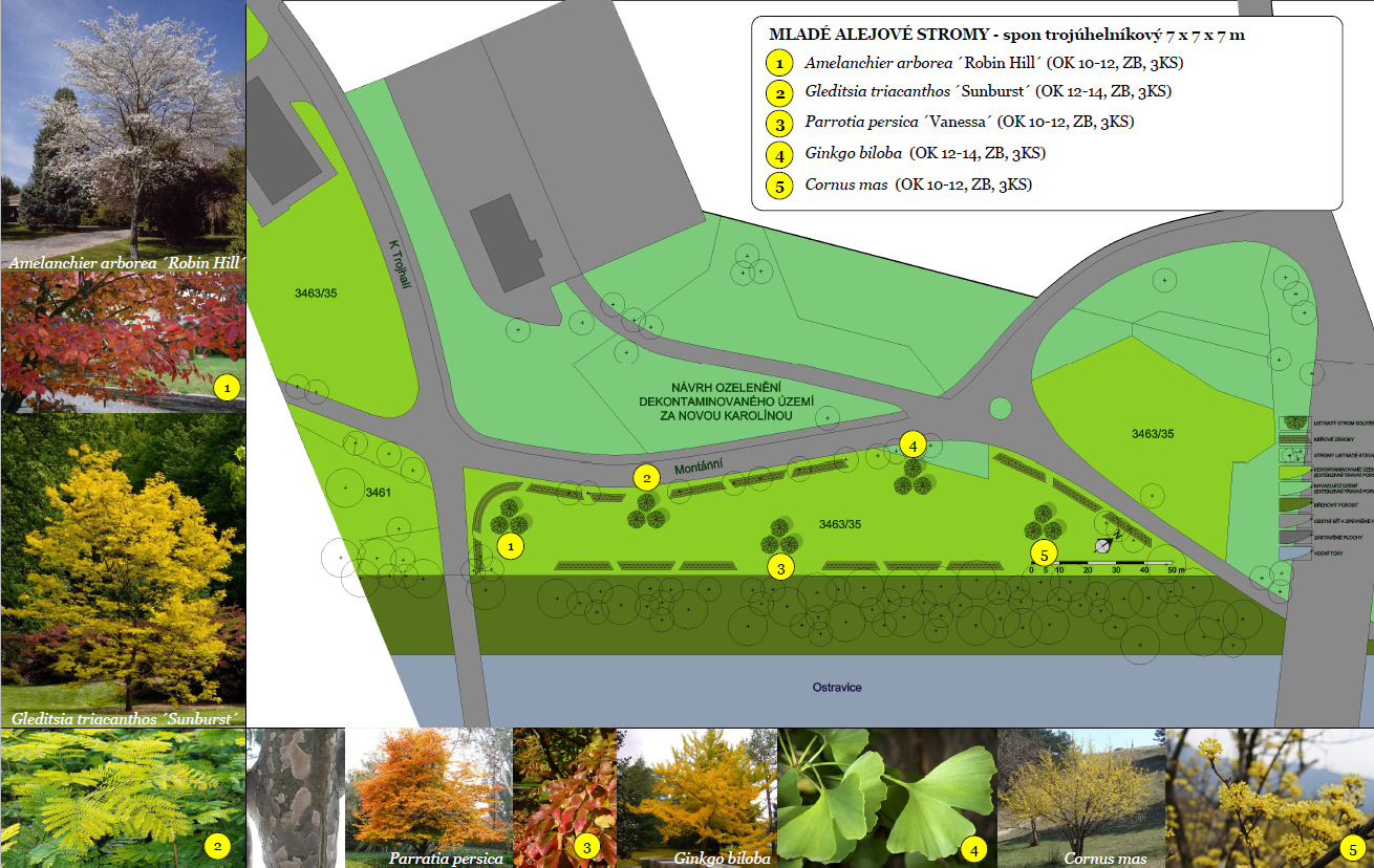 Ozelenění místa u břehu řeky Ostravice za Novou Karolinou resp. za Trojhalím zahrnuje výsadbu 15 ks mladých alejových dřevin sesazených do skupin po 3 ks – muchovníky (Amelanchier), dřezovce (Gleditsia), parócie (Parrotia), jinany (Ginkgo) a dříny (Cornus). Dále budou vysazeny keře, celkem 390 ks. Z časně kvetoucích dřevin dříny, kdoulovce, zlatice, kaliny, muchovníky, meruzalky a z dřevin s atraktivně zbarvenými prýty v zimním období svídy, zákuly.