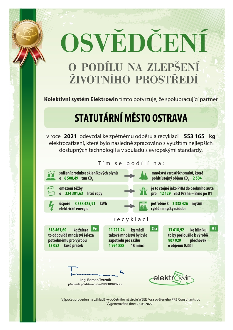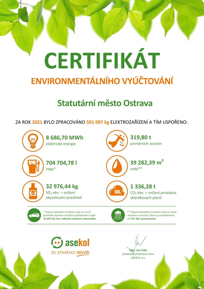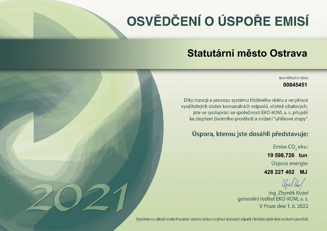 Autorizovaná obalová společnost EKO-KOM se zabývá provozem systému tříděného sběru a recyklace využitelných složek komunálních odpadů, včetně obalových. V rámci tohoto systému vytřídili v roce 2021 občané města 19 296 tun využitelných odpadů, a tím přispěli ke zlepšení životního prostředí a snížení „uhlíkové stopy“ úsporou emisí CO2 ekv. v množství 19 599 tun a úspoře energie v množství 428 227 402 MJ.